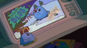 Sara's mom has to go to work, so she'll be staying home with Jeff. It's a special evening, Grumpy Blob's Xmas Special is on TV.